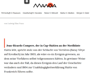 Allgemein Rebellen der Karibik von Ludwig Elias Franz am Donnerstag, Dezember 11, 2025 Liebe Grüße aus Merida in Yucatan: Es ist so weit mein Artikel über Haiti ist erschienen. Rebellen der Karibik Previous Post Next Post Ähnliche Artikel Allgemein Und dabei berührbar bleiben Allgemein Die Kunst der Freiheit Allgemein Schnee von gestern und die Sonne von morgen.